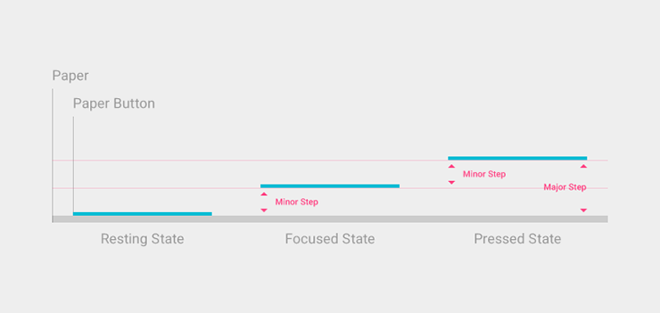 在一个特定的 app 里,根据 z 轴主要和次要的层阶[step],很多元素都是相对放置的。例如,一个按钮的聚焦状态是次要的层阶,而它的按下状态是一个主要的层阶。